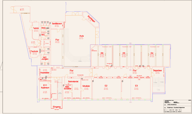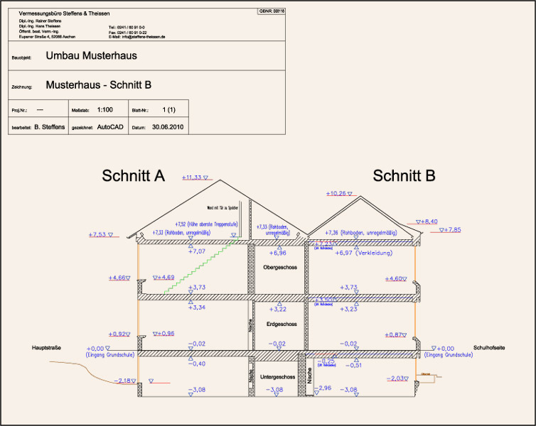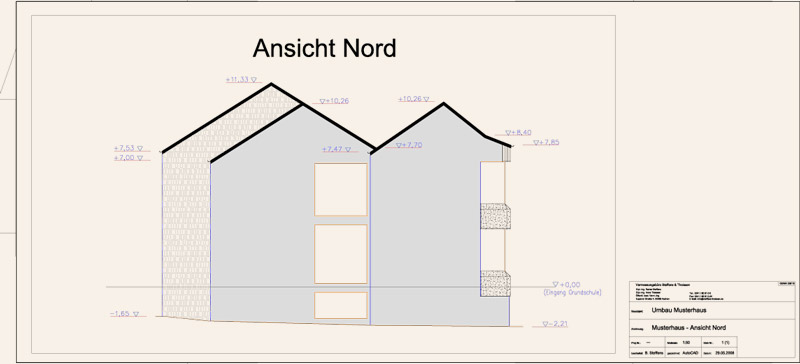 Wir erstellen Ihnen Zeichnungen von geplanten oder auch bestehenden Gebäuden oder anderen baulichen Anlagen. Dies umfasst Gebäudegrundrisse, Ansichten, Schnitte (z.B. Giebelschnitte) aber auch die Absteckung und die vermessungstechnische Aufnahme spezieller Fassaden. Wenn gewünscht, kann aus dem Aufmaß auch ein 3D-Modell des Gebäudes erstellt werden.
